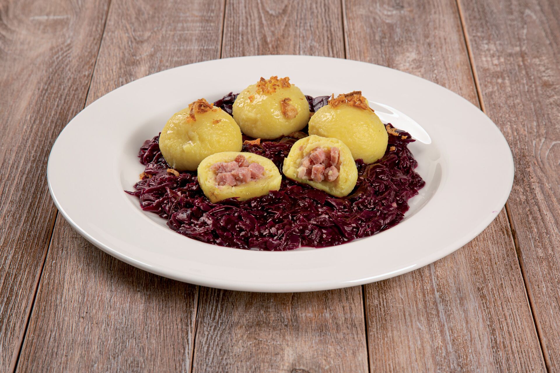 Na talíř vrstvíme zelí, na něj knedlíky, které můžeme rozkrojit, zakápneme sádlem a ozdobíme cibulkou.