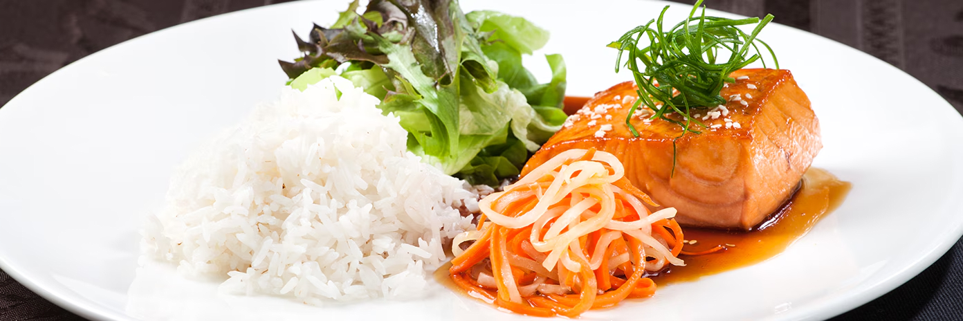 Losos teriyaki, mrkev, ředkev, salát, rýže