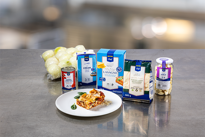 Do zapékací misky střídavě prokládáme syrové lasagne, hotovou omáčku a veloute. Můžeme také prokládat listy čerstvého špenátu. Končíme vrstvou lasagní, které posypeme parmazánem. Pečeme na 140 °C cca 45 minut - dle velikosti a výšky lasagní. Při servírování lasagne doplníme čerstvou bazalkou.